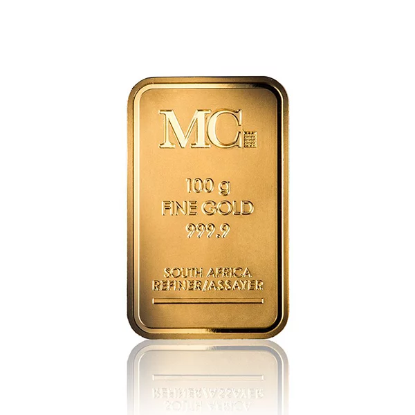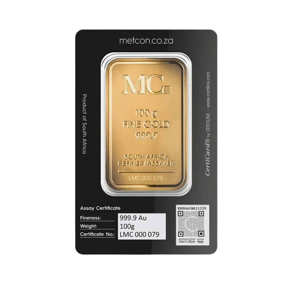 The obverse contains the MC logo, weight, metal and purity and country of origin, South Africa. A unique number is engraved along the bottom of the bar. The bar comes in MC branded tamper-resistant packaging in assay which features the correlating unique number, weight and metal fineness on the back as well as an authentication QR code.